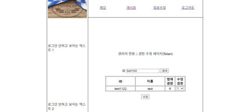 해당 페이지에서 원하는 계정의 권한을 1 -> 9로 수정하고 '수정' 버튼을 클릭하면 아래와 같이 alert창이 출력된다.
